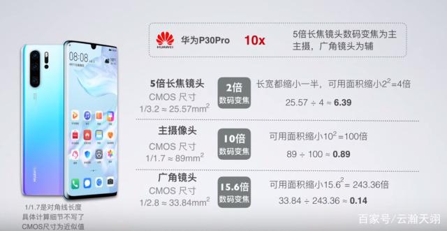 主摄像头的CMOS,原始面积为89,进行了10倍的数码变焦除以100,可用的仅仅只有0.89,而广角镜头就更惨了,相当于进行了15.6倍的数码变焦原始CMOS面积为33.84,算下来仅仅只有0.14,所以会说主摄和广角镜头在这个焦段能够做的是非常的少,基本上还是要靠长焦镜头的数码变焦。